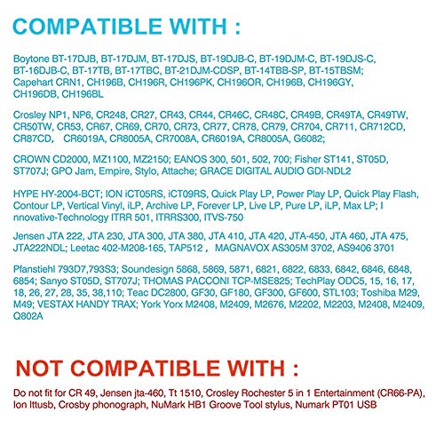 - Compatible with most of turntables like: Anders Nicholson,Boytone,Capehart,Crosley, CROWN, Fisher, GPO, GRACE DIGITAL, ION, Innovative-Technology, Jensen, Leetac, Pfanstiehl, Radio Shack, Soundesign, Sanyo, THOMAS PACCONI, TechPlay, Teac, Toshiba, York Yorx