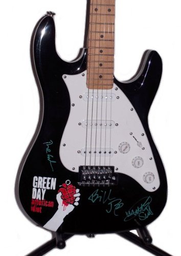 This is an Eleca black electric guitar that has been hand-signed by Billie Joe Armstrong, Mike Dirnt and Tre Cool of Green Day. It has been custom airbrushed with the band’s American Idiot album cover. The signatures have been certified authentic by an independent third party authenticator and will come with a Certificate of Authenticity. Each COA has a unique serial number which can used to verify authenticity at anytime. The guitar is full sized and fully functional.