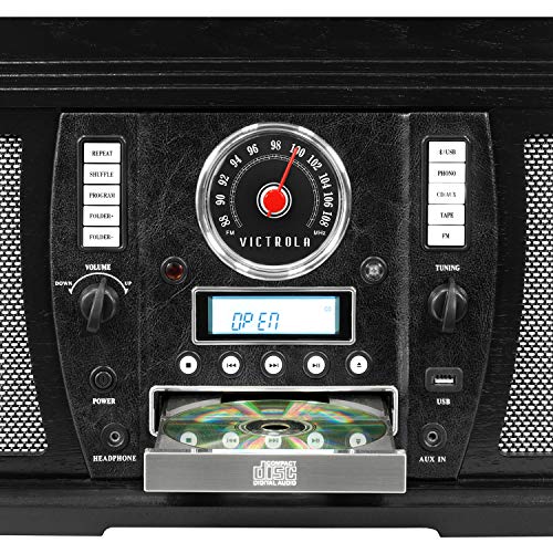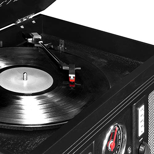 - This premium entertainment system includes built-in Bluetooth to wirelessly play music from your Bluetooth enabled device and the ability to record from vinyl to MP3 (Mac/PC software and USB cable included). Additional features: USB playback, CD and cassette player, FM radio with a nostalgic rotary dial, 3.5mm Aux-in jack for playing music from any non-Bluetooth device, headphone jack, and RCA Jacks. Bluetooth Version: V2.1+EDR; Bluetooth Profiles: A2DP, AVRCP.