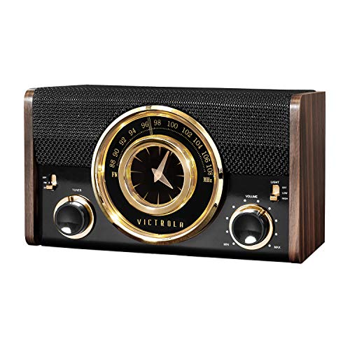he Victrola Bluetooth Analog Clock Radio features a Classic FM Radio with Analog Tuner and “Around The Dial” LED Lighting. You can also wirelessly stream music from your Bluetooth enabled device up to 33 feet away. It also includes an Analog Clock Display with Dimmer and a USB Port for easy charging as well as a Battery Backup for the clock function (batteries not included).